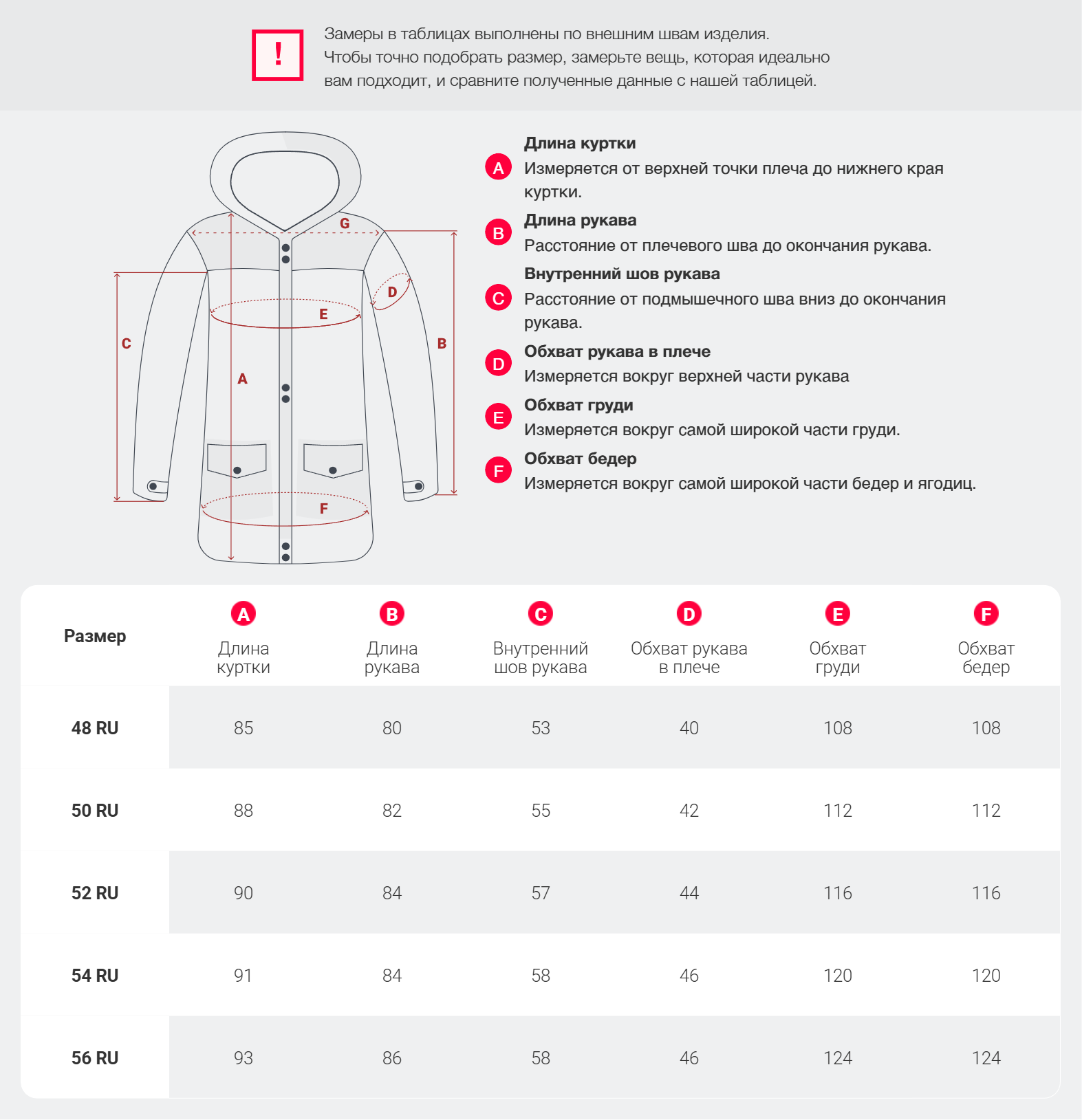 • A Длина курткиИзмеряется от верхней точки плеча до нижнего края куртки.