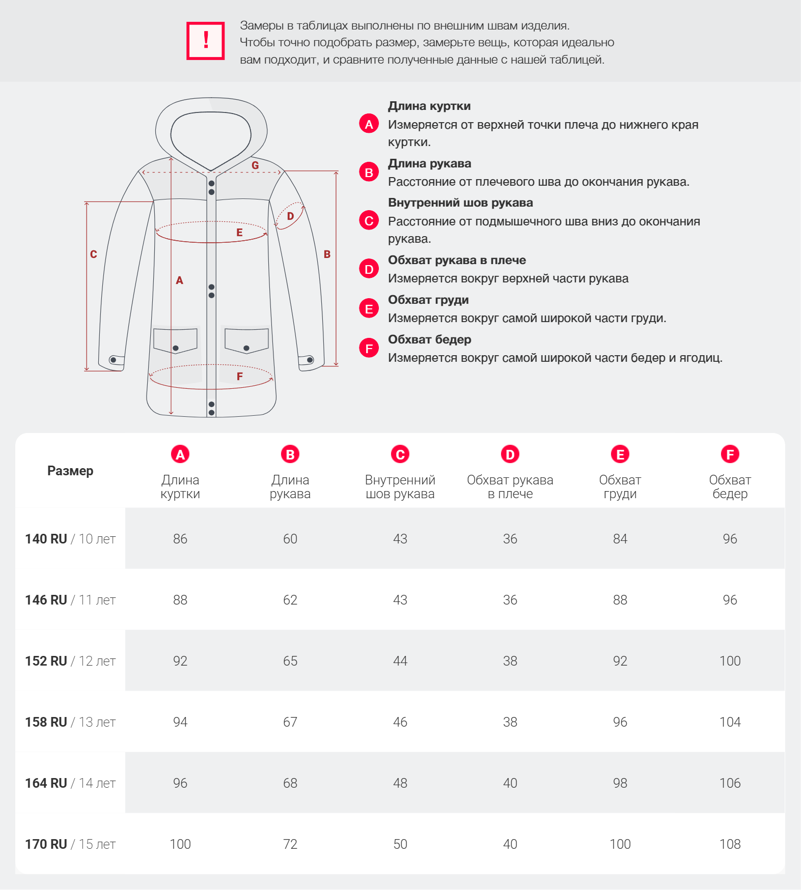 - A Длина курткиИзмеряется от верхней точки плеча до нижнего края куртки.
