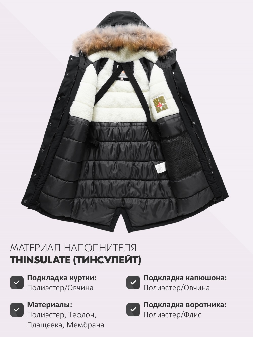 - Манжеты, Мех, Пояс/ремень, Съемная опушка